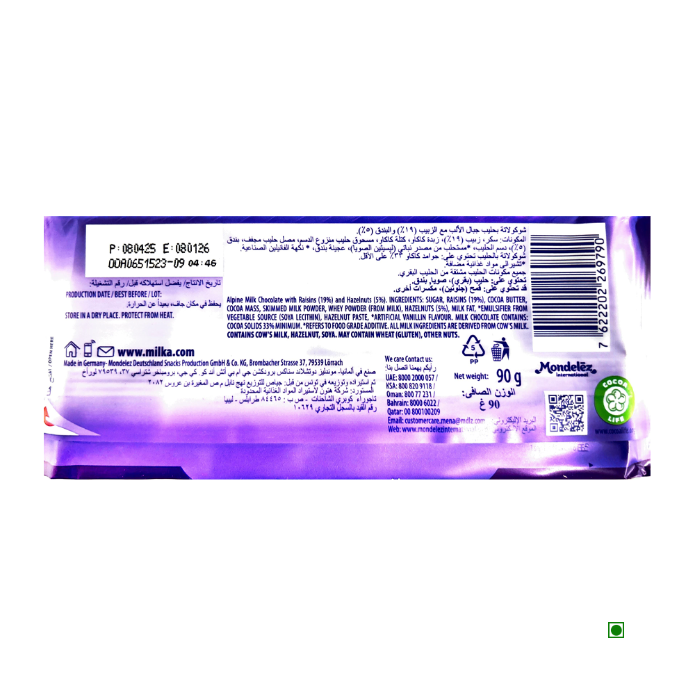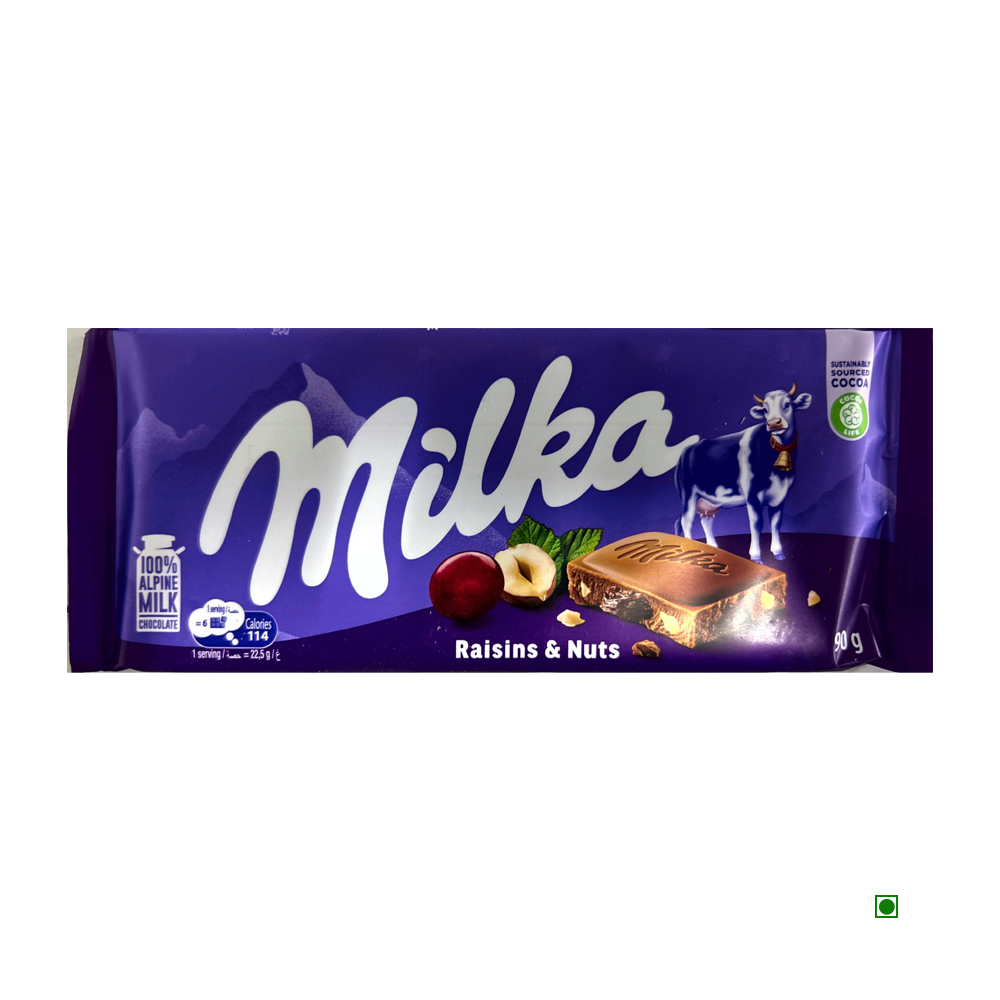 The Milka Raisins & Nut Bar is a chocolate bar made with smooth Alpine milk chocolate combined with juicy raisins and crunchy hazelnut pieces, offering a contrast of textures and flavors for a sweet treat.