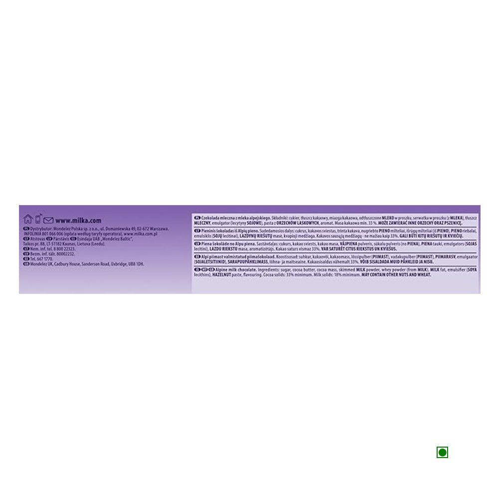 Ingredients: sugar, cocoa butter, cocoa mass, skimmed MILK powder, whey powder (from MILK ), MILK fat, emulsifier ( SOY lecithins), HAZELNUT paste, flavouring. Alpine milk chocolate contains at least 33% cocoa solids.