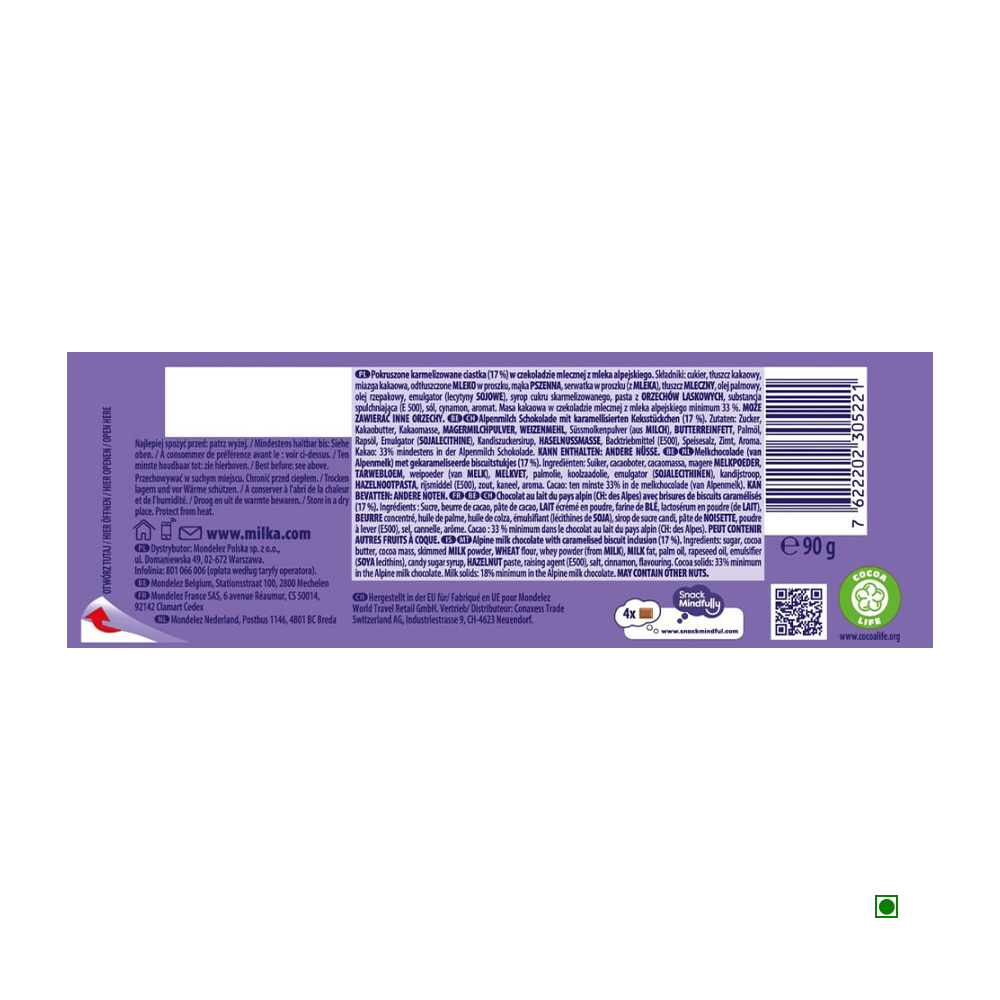 Ingredients - Sugar, cocoa butter, cocoa mass, skimmed milk powder, wheat flour, whey powder, milk fat, palm oil, rapeseed oil, emulsifier, soy lecithins, sugar syrup, hazelnut paste, raising agent, E500 - sodium carbonates, salt, cinnamon, flavoring.