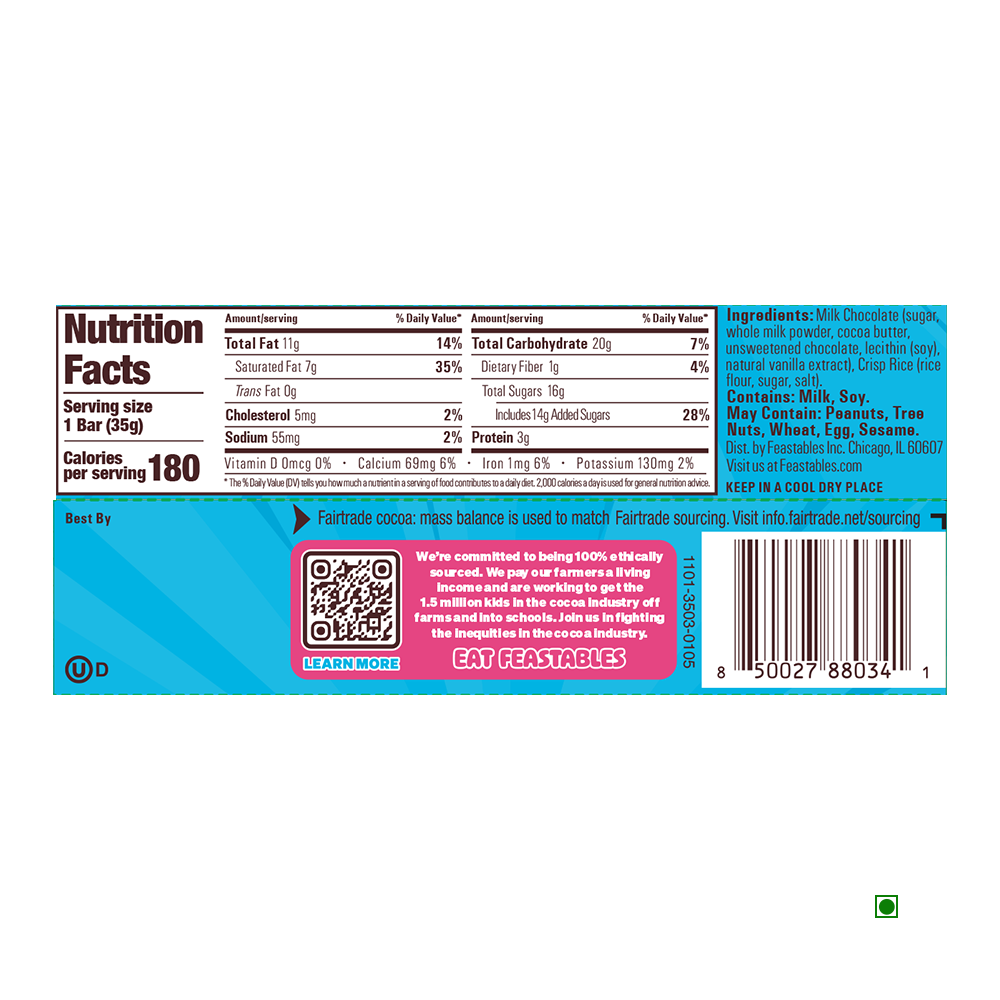 whole milk powder, cocoa butter,unsweetened chocolate, lecithin (soy),natural vanilla extract), Crisp Rice (rice flour, sugar, salt).