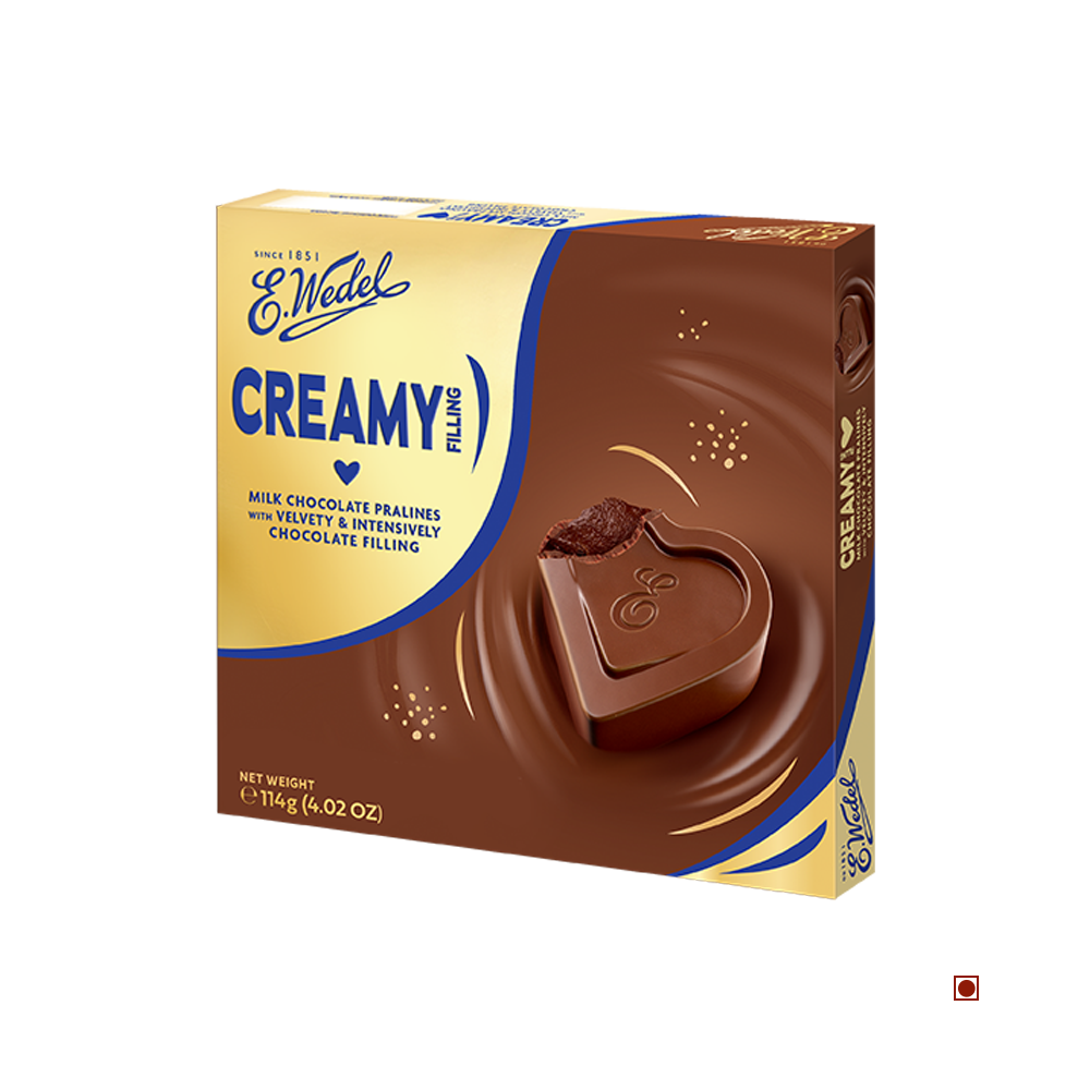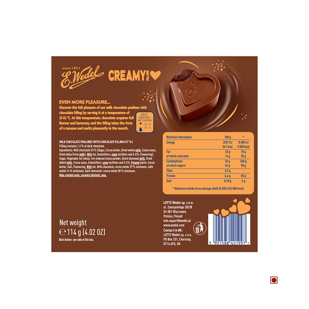 A feast for fans of multi-sensory taste sensations or a refi ned gift for any occasion. Our Creamy Milk chocolate pralines with chocolate filling contain only original Wedel chocolate.
