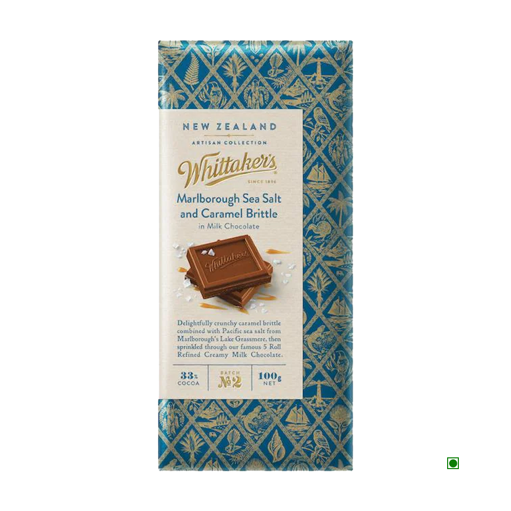 Marlborough Sea Salt & Caramel Brittle 33% COCOA. Crunchy caramel brittle, a hint of Marlborough sea salt and our incredibly smooth 33% cocoa 5 Roll Refined Creamy Milk chocolate.